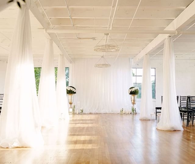 We offer ivory and white sheer draping. Custom draping colors are available for an additional charge. Our draping for weddings and events can reach up to 22 feet tall.